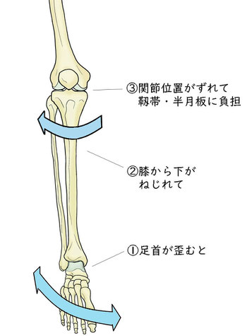 この状態で運動すると、足首が屈伸するたびに、膝から下がねじられます。